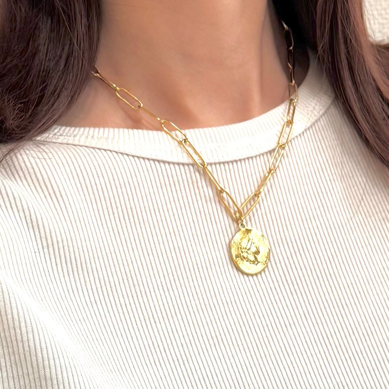 シンプルでありながら、首元に確かな存在感を添えるコインモチーフのネックレス。上品なゴールドの輝きが、カジュアルにもフォーマルにも絶妙にマッチします。