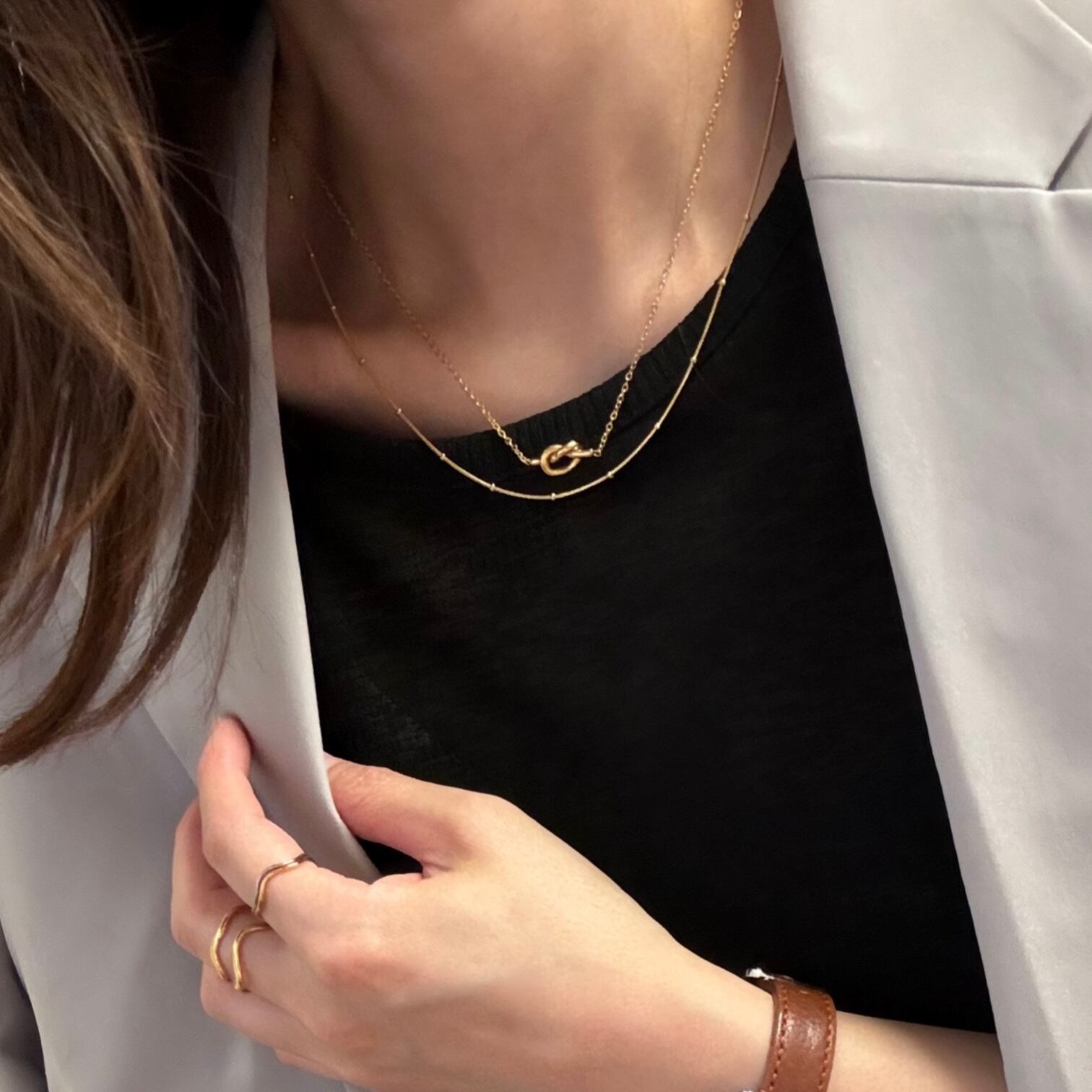 『結び目』の意味は、絆や結びつきを象徴しており、愛や友情を表現するシンボルとしても人気です。華奢なチェーンが首元を綺麗に飾り、存在感を引き立てます。