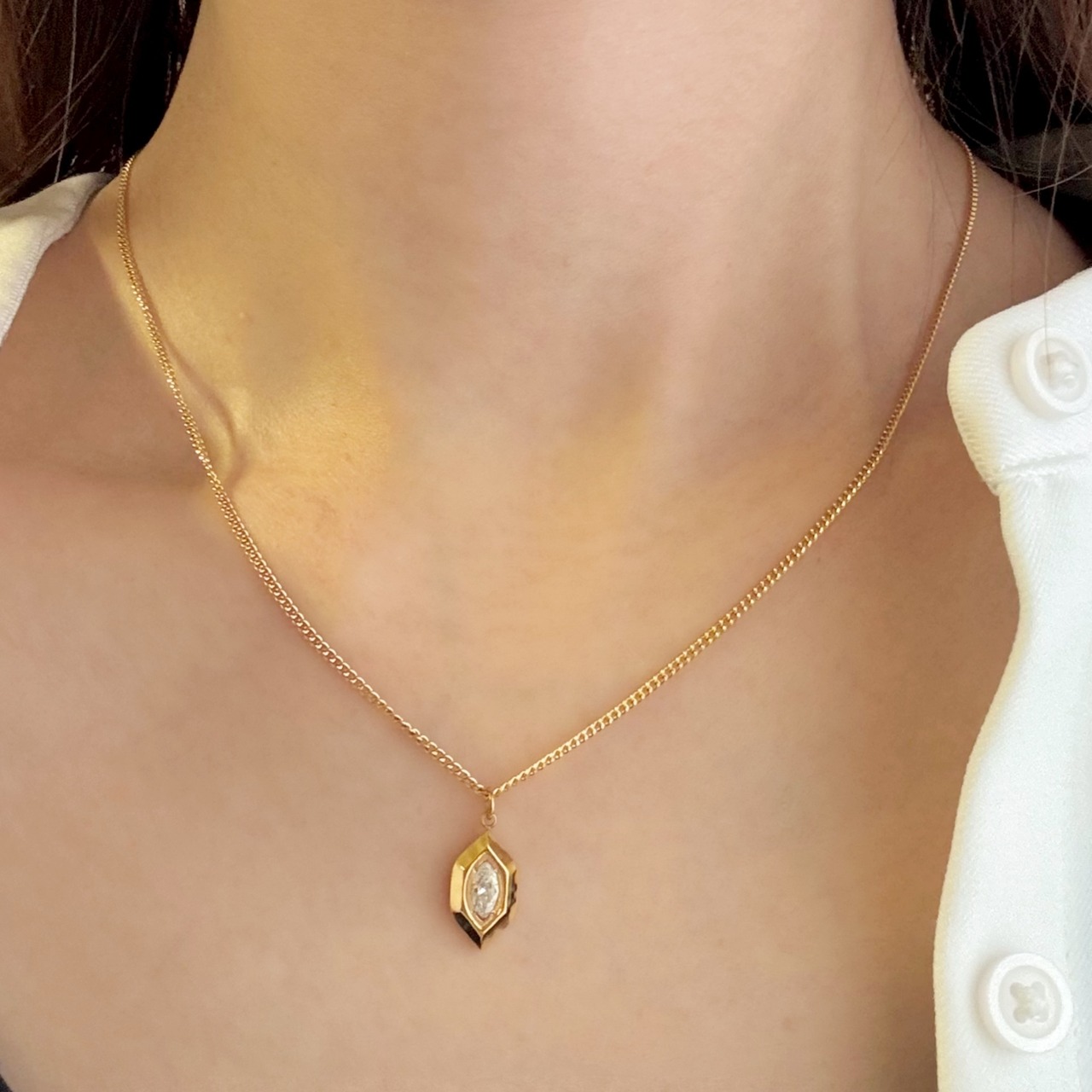 マーキスカットが施されている石はシャープな輝きが特徴的。首元をスッキリと見せてくれスタイルアップに期待できます。長さ調整可能なため、重ね着けでもお楽しみいただけます。