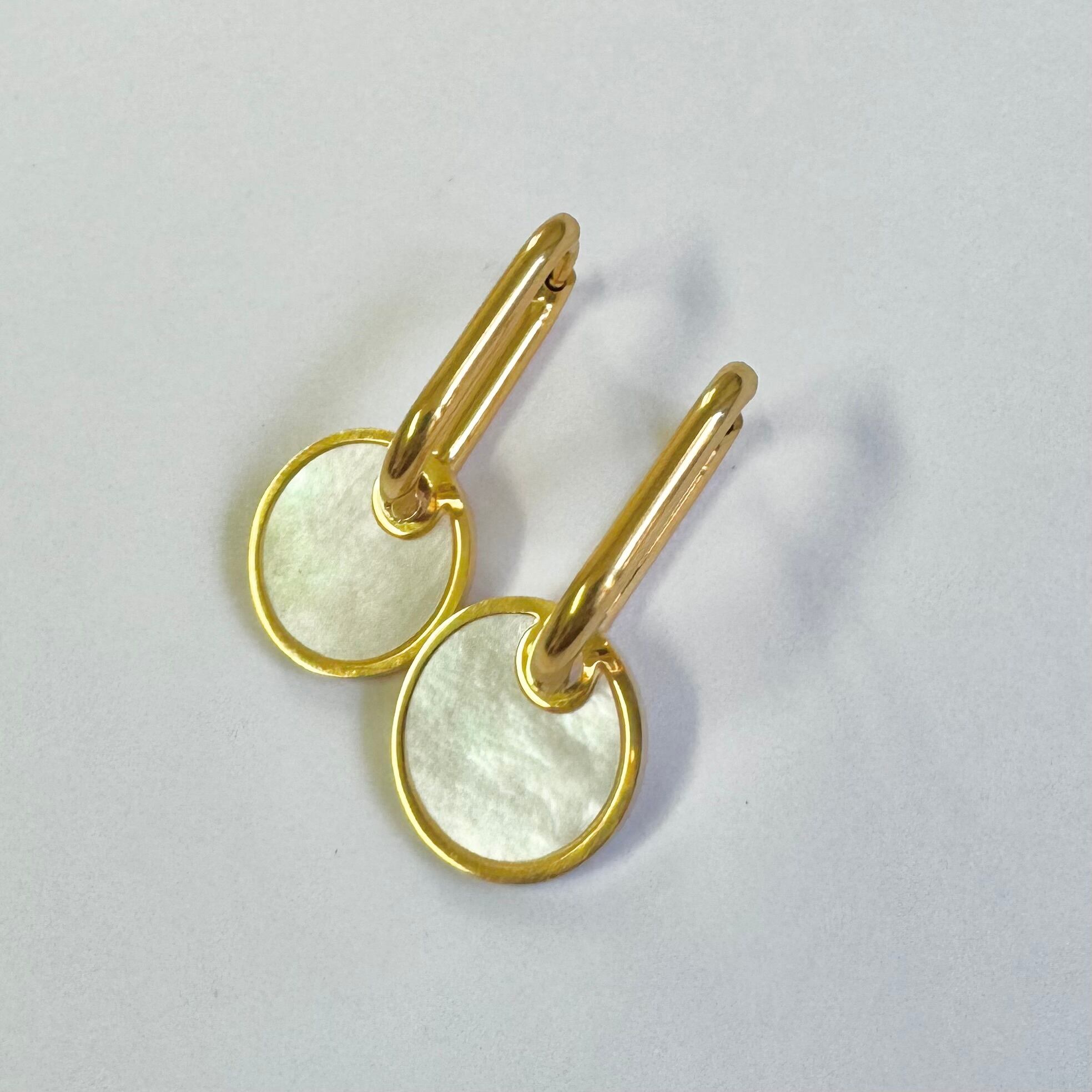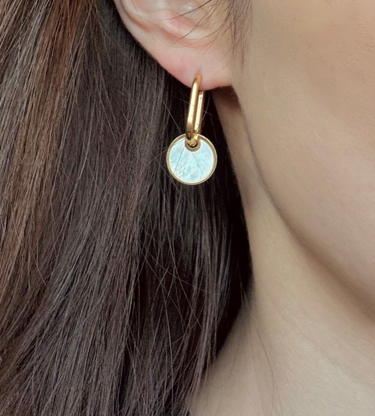 海のような美しさを感じさせる、シェルを使ったピアス。丸い形が女性らしさを引き立て、さりげない動きを演出します。